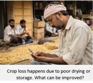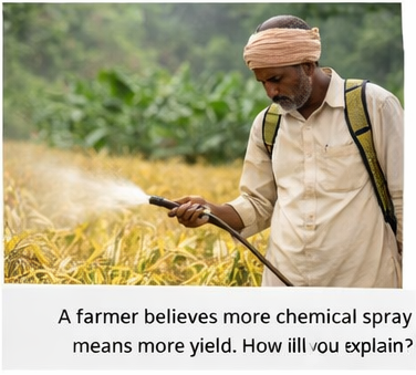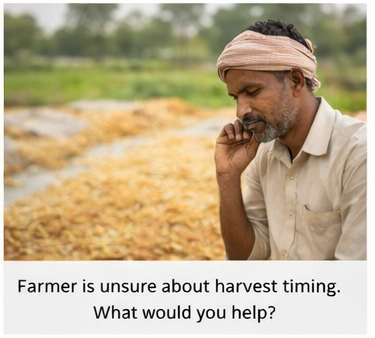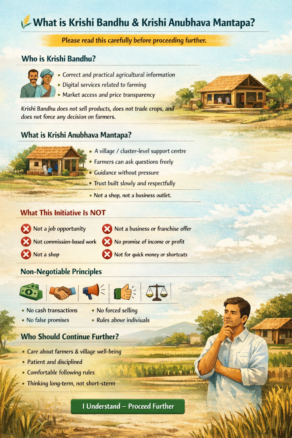 If you are interested in understanding Krishi Anubhava Mantapa further, you may fill the form below.Seed Selection ConfusionQ1️⃣ A farmer is confused about which seed variety to choose. Different people are suggesting different brands and promising high yield. How would you help the farmer decide ? Q 1️⃣ ಬೀಜ ಆಯ್ಕೆ ಗೊಂದಲ ರೈತನಿಗೆ ಯಾವ ಬೀಜ ವಿಧವನ್ನು ಆಯ್ಕೆ ಮಾಡಬೇಕೆಂಬ ಗೊಂದಲವಿದೆ. ವಿಭಿನ್ನ ಜನರು ವಿಭಿನ್ನ ಬ್ರಾಂಡ್ಗಳನ್ನು ಸೂಚಿಸುತ್ತಿದ್ದಾರೆ ಮತ್ತು ಹೆಚ್ಚಿನ ಇಳುವರಿಯನ್ನು ಭರವಸೆ ನೀಡುತ್ತಿದ್ದಾರೆ. ರೈತ ನಿರ್ಧರಿಸಲು ನೀವು ಹೇಗೆ ಸಹಾಯ ಮಾಡುತ್ತೀರಿ ? *Fake / Low-Quality InputsQ2️⃣ A farmer feels the seed or fertilizer he purchased earlier did not give expected results. How would you guide him before the next sowing season? ಪ್ರಶ್ನೆ 2️⃣ ಒಬ್ಬ ರೈತ ತಾನು ಮೊದಲು ಖರೀದಿಸಿದ ಬೀಜ ಅಥವಾ ಗೊಬ್ಬರ ನಿರೀಕ್ಷಿತ ಫಲಿತಾಂಶವನ್ನು ನೀಡಿಲ್ಲ ಎಂದು ಭಾವಿಸುತ್ತಾನೆ. ಮುಂದಿನ ಬಿತ್ತನೆ ಋತುವಿಗೆ ಮೊದಲು ನೀವು ಅವನಿಗೆ ಹೇಗೆ ಮಾರ್ಗದರ್ಶನ ನೀಡುತ್ತೀರಿ? *Pest & Disease PanicQ3️⃣ A farmer suddenly sees pest or disease in his crop and panics. What should be the first step to support him? ಪ್ರಶ್ನೆ 3️⃣ ಒಬ್ಬ ರೈತ ತನ್ನ ಬೆಳೆಯಲ್ಲಿ ಕೀಟ ಅಥವಾ ರೋಗವನ್ನು ಇದ್ದಕ್ಕಿದ್ದಂತೆ ನೋಡಿ ಭಯಭೀತರಾಗುತ್ತಾನೆ. ಅವನಿಗೆ ಬೆಂಬಲ ನೀಡಲು ಮೊದಲ ಹೆಜ್ಜೆ ಏನಾಗಿರಬೇಕು? *Overuse of ChemicalsQ4️⃣ A farmer is repeatedly spraying chemicals because someone told him “more spray gives more yield.” How would you explain the risks and guide him correctly? ಪ್ರಶ್ನೆ 4️⃣ ಒಬ್ಬ ರೈತ ಪದೇ ಪದೇ ರಾಸಾಯನಿಕಗಳನ್ನು ಸಿಂಪಡಿಸುತ್ತಿದ್ದಾನೆ ಏಕೆಂದರೆ ಯಾರೋ ಅವನಿಗೆ "ಹೆಚ್ಚು ಸಿಂಪಡಣೆ ಮಾಡಿದರೆ ಹೆಚ್ಚಿನ ಇಳುವರಿ ಬರುತ್ತದೆ" ಎಂದು ಹೇಳಿದರು. ನೀವು ಅಪಾಯಗಳನ್ನು ಹೇಗೆ ವಿವರಿಸುತ್ತೀರಿ ಮತ್ತು ಅವನಿಗೆ ಸರಿಯಾಗಿ ಮಾರ್ಗದರ್ಶನ ನೀಡುತ್ತೀರಿ? *Weather UncertaintyQ5️⃣ Unexpected rain or drought affects the crop, and the farmer feels helpless. What realistic support or guidance can be given at this stage? Q5️⃣ ಅನಿರೀಕ್ಷಿತ ಮಳೆ ಅಥವಾ ಬರಗಾಲವು ಬೆಳೆಯ ಮೇಲೆ ಪರಿಣಾಮ ಬೀರುತ್ತದೆ, ಮತ್ತು ರೈತ ಅಸಹಾಯಕನಾಗುತ್ತಾನೆ. ಈ ಹಂತದಲ್ಲಿ ಯಾವ ವಾಸ್ತವಿಕ ಬೆಂಬಲ ಅಥವಾ ಮಾರ್ಗದರ್ಶನವನ್ನು ನೀಡಬಹುದು? *Harvest Timing ConfusionQ6️⃣ A farmer is unsure whether to harvest now or wait for a better yield or price. How would you help him think through this decision? Q6️⃣ ಒಬ್ಬ ರೈತನಿಗೆ ಈಗ ಕೊಯ್ಲು ಮಾಡಬೇಕೇ ಅಥವಾ ಉತ್ತಮ ಇಳುವರಿ ಅಥವಾ ಬೆಲೆಗಾಗಿ ಕಾಯಬೇಕೇ ಎಂದು ಖಚಿತವಿಲ್ಲ. ಈ ನಿರ್ಧಾರದ ಬಗ್ಗೆ ಯೋಚಿಸಲು ನೀವು ಅವನಿಗೆ ಹೇಗೆ ಸಹಾಯ ಮಾಡುತ್ತೀರಿ? *Storage LossQ7️⃣ After harvest, a farmer faces loss due to poor storage or lack of drying facilities. What practical steps would you suggest? Q7️⃣ ಕೊಯ್ಲಿನ ನಂತರ, ಕಳಪೆ ಸಂಗ್ರಹಣೆ ಅಥವಾ ಒಣಗಿಸುವ ಸೌಲಭ್ಯಗಳ ಕೊರತೆಯಿಂದಾಗಿ ರೈತ ನಷ್ಟವನ್ನು ಎದುರಿಸುತ್ತಾನೆ. ನೀವು ಯಾವ ಪ್ರಾಯೋಗಿಕ ಕ್ರಮಗಳನ್ನು ಸೂಚಿಸುತ್ತೀರಿ? *Low Price at MarketQ8️⃣ A farmer goes to the market and feels the price offered is unfair. What options or information would you help him explore? Q8️⃣ ಒಬ್ಬ ರೈತ ಮಾರುಕಟ್ಟೆಗೆ ಹೋಗಿ ಅಲ್ಲಿ ನೀಡುವ ಬೆಲೆ ಅನ್ಯಾಯವಾಗಿದೆ ಎಂದು ಭಾವಿಸುತ್ತಾನೆ. ಅವನಿಗೆ ಯಾವ ಆಯ್ಕೆಗಳು ಅಥವಾ ಮಾಹಿತಿಯನ್ನು ಅನ್ವೇಷಿಸಲು ನೀವು ಸಹಾಯ ಮಾಡುತ್ತೀರಿ? *Payment & Trust IssuesQ9️⃣A farmer sells produce but payment is delayed or uncertain. How can such situations be handled to protect the farmer? ಪ್ರಶ್ನೆ 9️⃣ ರೈತನು ತನ್ನ ಉತ್ಪನ್ನಗಳನ್ನು ಮಾರಾಟ ಮಾಡುತ್ತಾನೆ ಆದರೆ ಪಾವತಿ ವಿಳಂಬವಾಗುತ್ತದೆ ಅಥವಾ ಅನಿಶ್ಚಿತವಾಗಿರುತ್ತದೆ. ರೈತನನ್ನು ರಕ್ಷಿಸಲು ಅಂತಹ ಸಂದರ್ಭಗಳನ್ನು ಹೇಗೆ ನಿರ್ವಹಿಸಬಹುದು? *Overall Farmer SupportQ🔟 From seed to selling, what do you feel is the biggest problem farmers face in your village today? If given a chance, how would you try to improve it? ಪ್ರಶ್ನೆ 🔟 ಬೀಜದಿಂದ ಮಾರಾಟದವರೆಗೆ, ನಿಮ್ಮ ಹಳ್ಳಿಯಲ್ಲಿ ಇಂದು ರೈತರು ಎದುರಿ