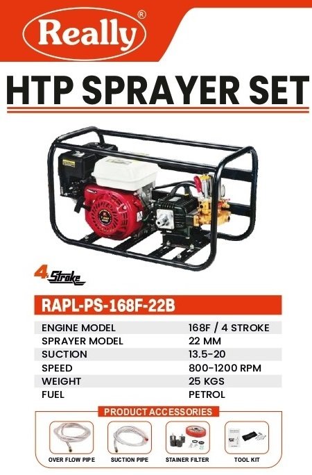 The Really HTP Sprayer Set (RAPL-PS-168F-22B) is built with a 168F 4-Stroke Petrol Engine, making it highly reliable and efficient for spraying pesticides, insecticides, fungicides, and fertilizers. Its lightweight design and strong suction capacity make it ideal for small to medium farms and horticultural use.