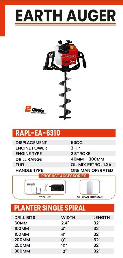 The RAPL-EA-6310 Earth Auger is a powerful, fuel-efficient digging machine designed for effortless soil drilling. Ideal for planting, fencing, landscaping, and agricultural needs, this auger is a must-have tool for farmers and professionals.