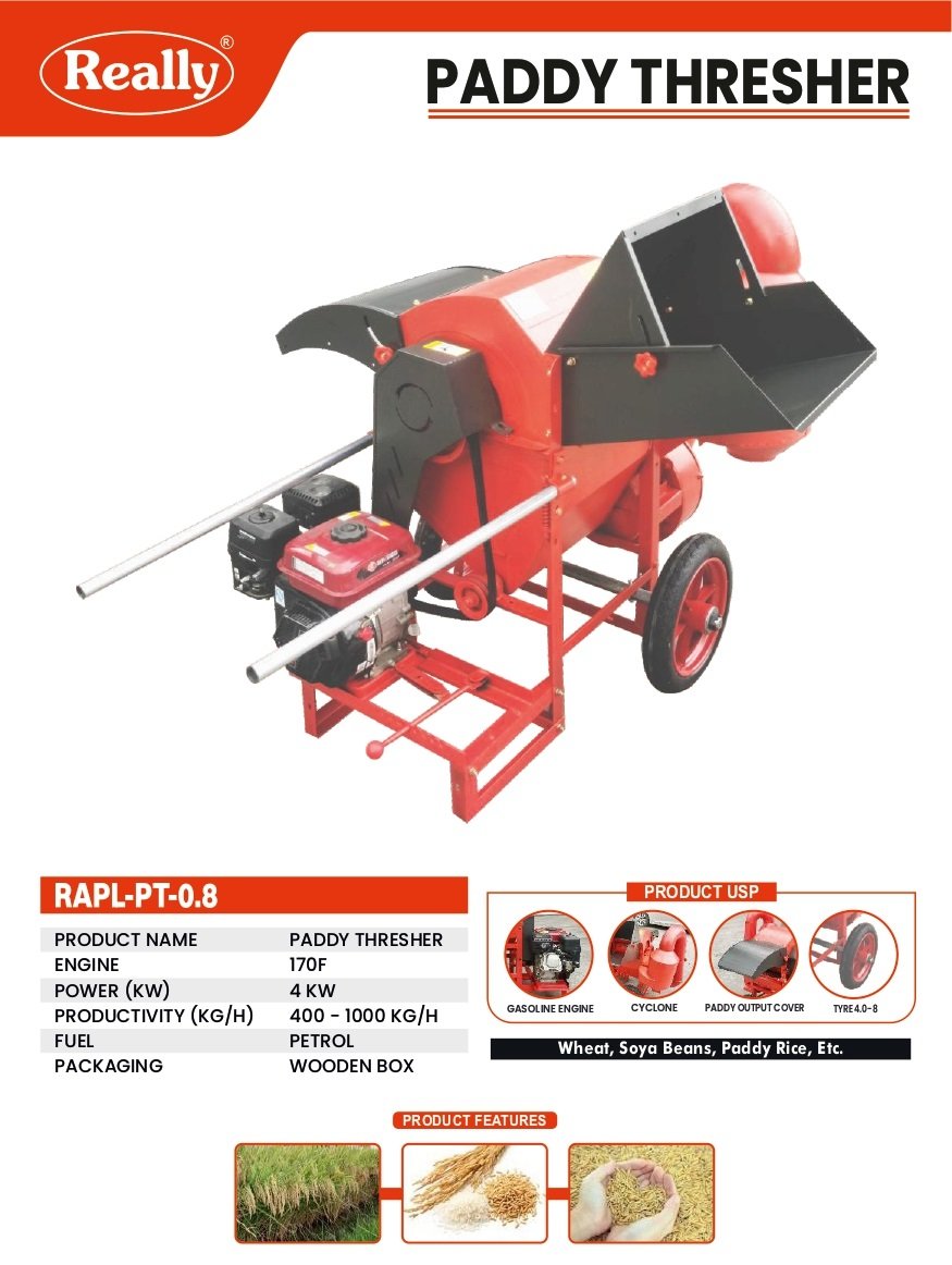 The Really Paddy Thresher RAPL-PT-0.8 is a compact, petrol-engine powered machine designed for efficient threshing of paddy and other grains. It separates the grains from the straw and husk quickly, ensuring high productivity with minimal labor. Ideal for small and medium farmers, this machine increases efficiency and reduces dependency on manual threshing.