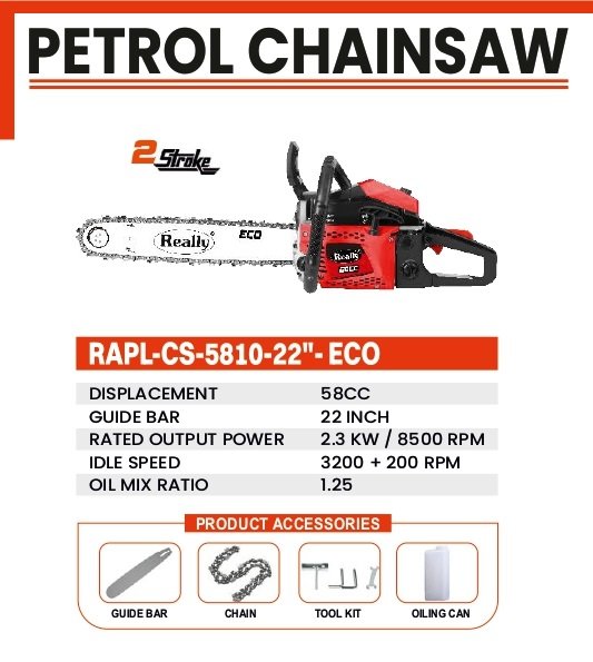 The RAPL-CS-5810 ECO Petrol Chainsaw is a heavy-duty, 2-stroke machine designed for efficient cutting of wood, trees, and logs. With a powerful 58cc engine and a 22-inch guide bar, it is perfect for both professional forestry use and farm applications.