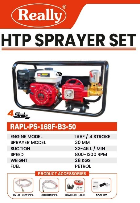 The Really HTP Sprayer Set (RAPL-PS-168F-B3-50) is designed to meet the spraying needs of modern farmers. Equipped with a 4-Stroke 168F Petrol Engine, this sprayer ensures durability, efficiency, and high performance for spraying pesticides, fertilizers, and other solutions on crops.